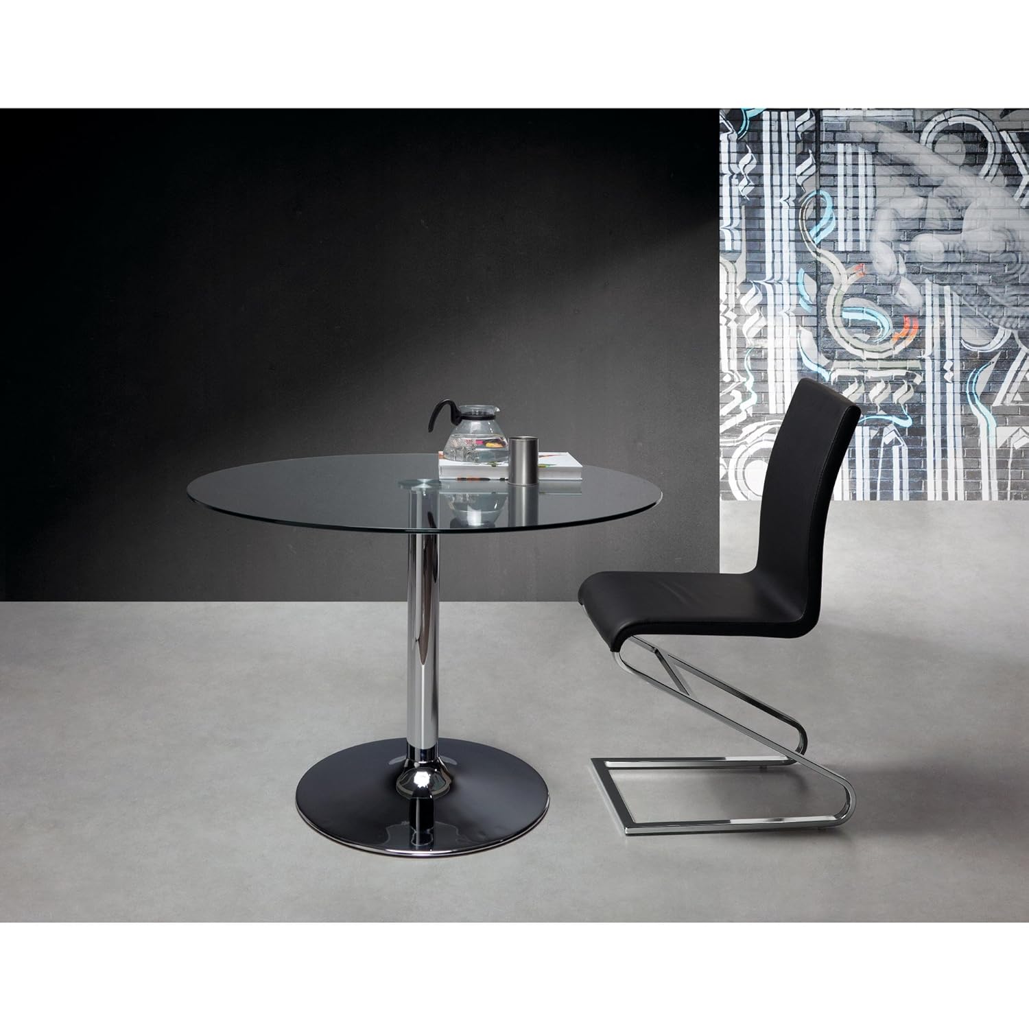 Mesa de comedor con base metálica de acero cromado y superficie de vidrio templado.