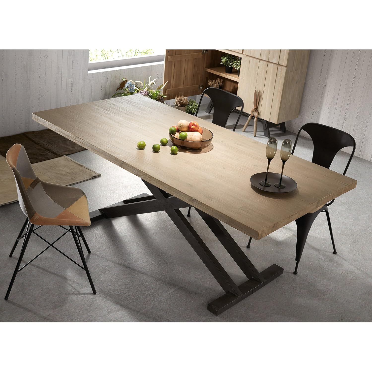 Mesa en madera de acacia maciza en acabado natural blanqueado. Pies en metal pintado envejecido.